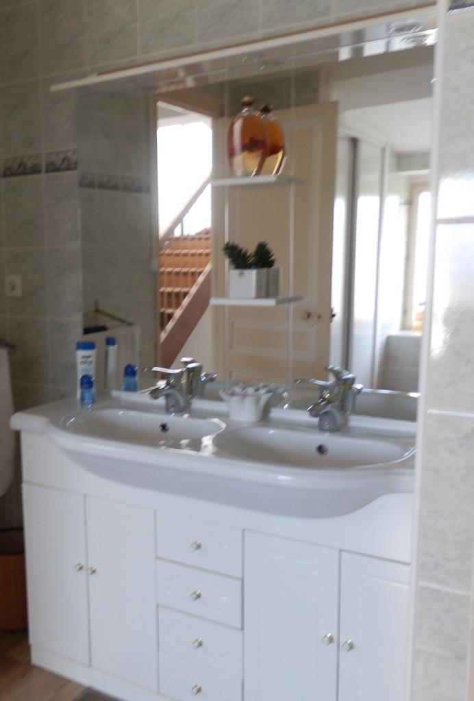 Une chambre à louer avec lit double et lit simple ainsi que sa propre salle de bains. Mise à disposition d’une grande cuisine commune ainsi que d’une machine à laver le linge et des parties communes extérieures.